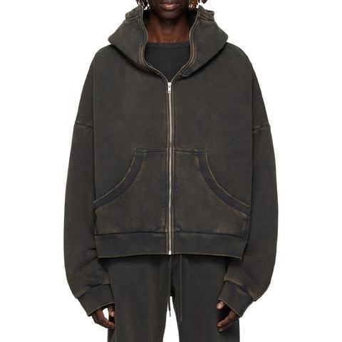 2024 Premium Katoenen Franse Badstof Heren Full Face Zip-Up Oversized Hoodie Sneeuw Gewassen Vintage Zwart Distressed 3d Patroon